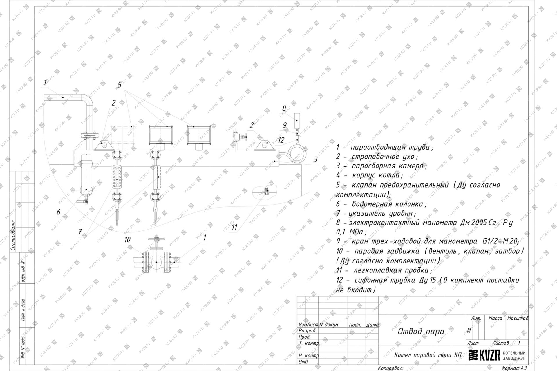 В верхней части котла приварен паросборник, представляющий собой полуцилиндр. На паросборной камере устанавливаются предохранительные клапаны и два штуцера Ду15, один для установки электроконтактного манометра, второй для спуска воздуха с котла при заполнении водой при подготовке к работе.