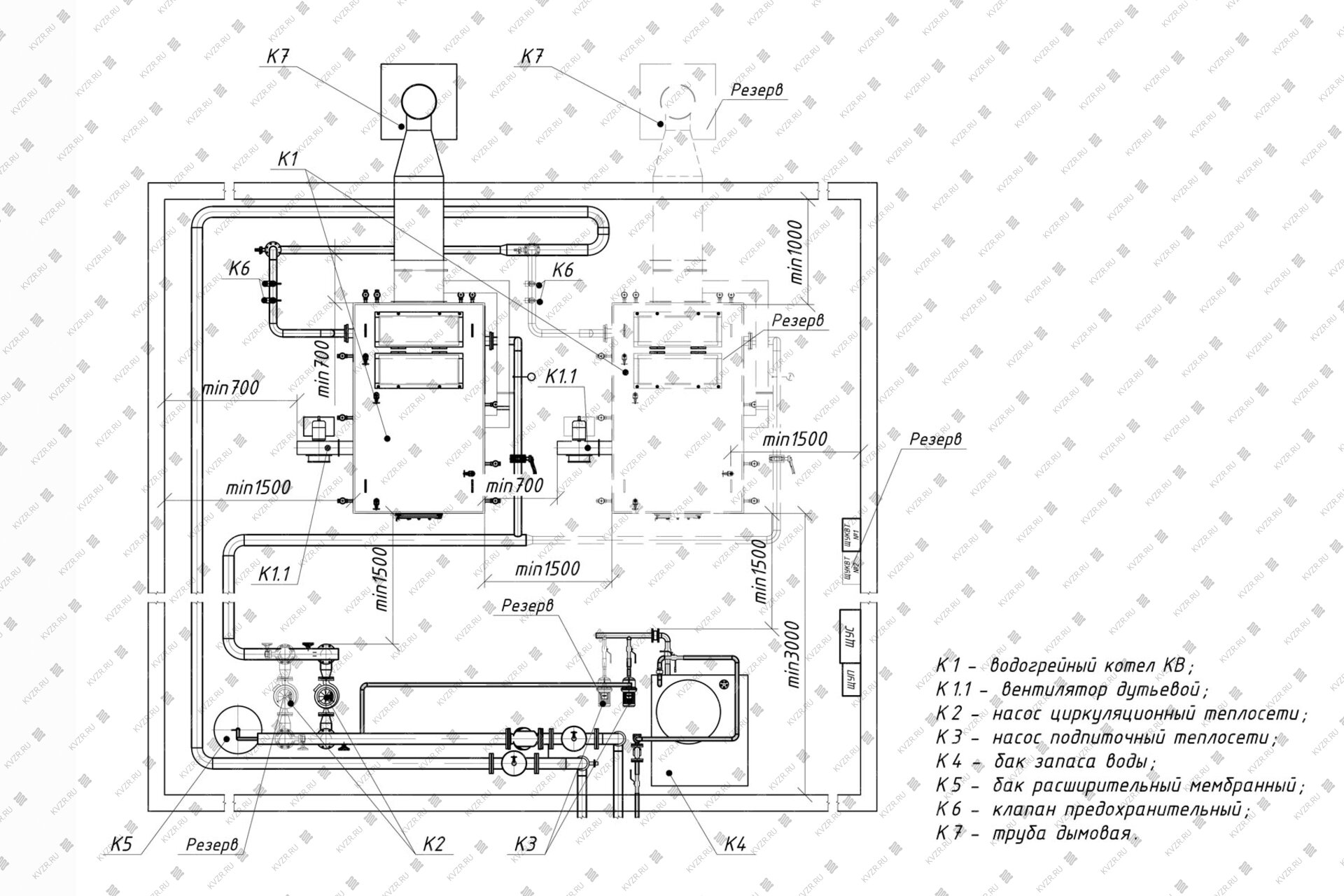 Чтобы правильно подключить котел КВ-0.35 без дымососа на самотяге в котельной необходимо оставить проемы для обслуживания оборудования во время эксплуатации. На представленной здесь схеме указаны их минимальные размеры. Кроме того, в данной примерной схеме монтажа водогрейных котлов и оборудования указан перечень минимально необходимого вспомогательного оборудования для правильной работы котла.