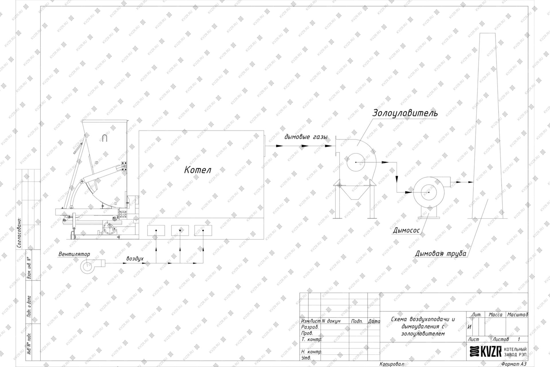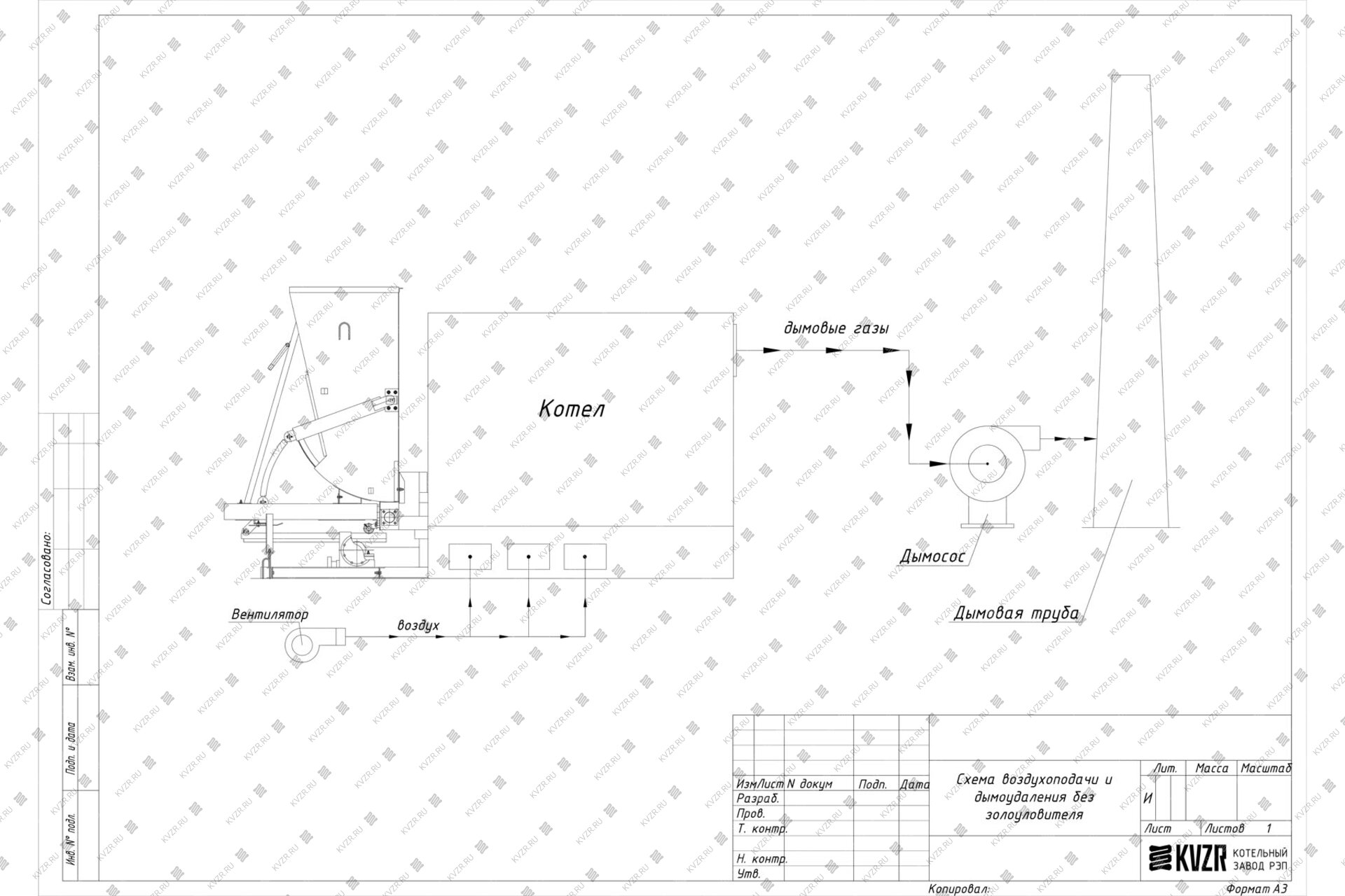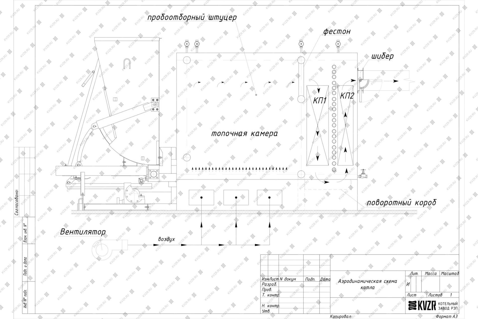 2. Горение: Воздух на горение твердого топлива подается принудительно дутьевым вентилятором. Интенсивность горения регулируется шибером на воздуховоде.