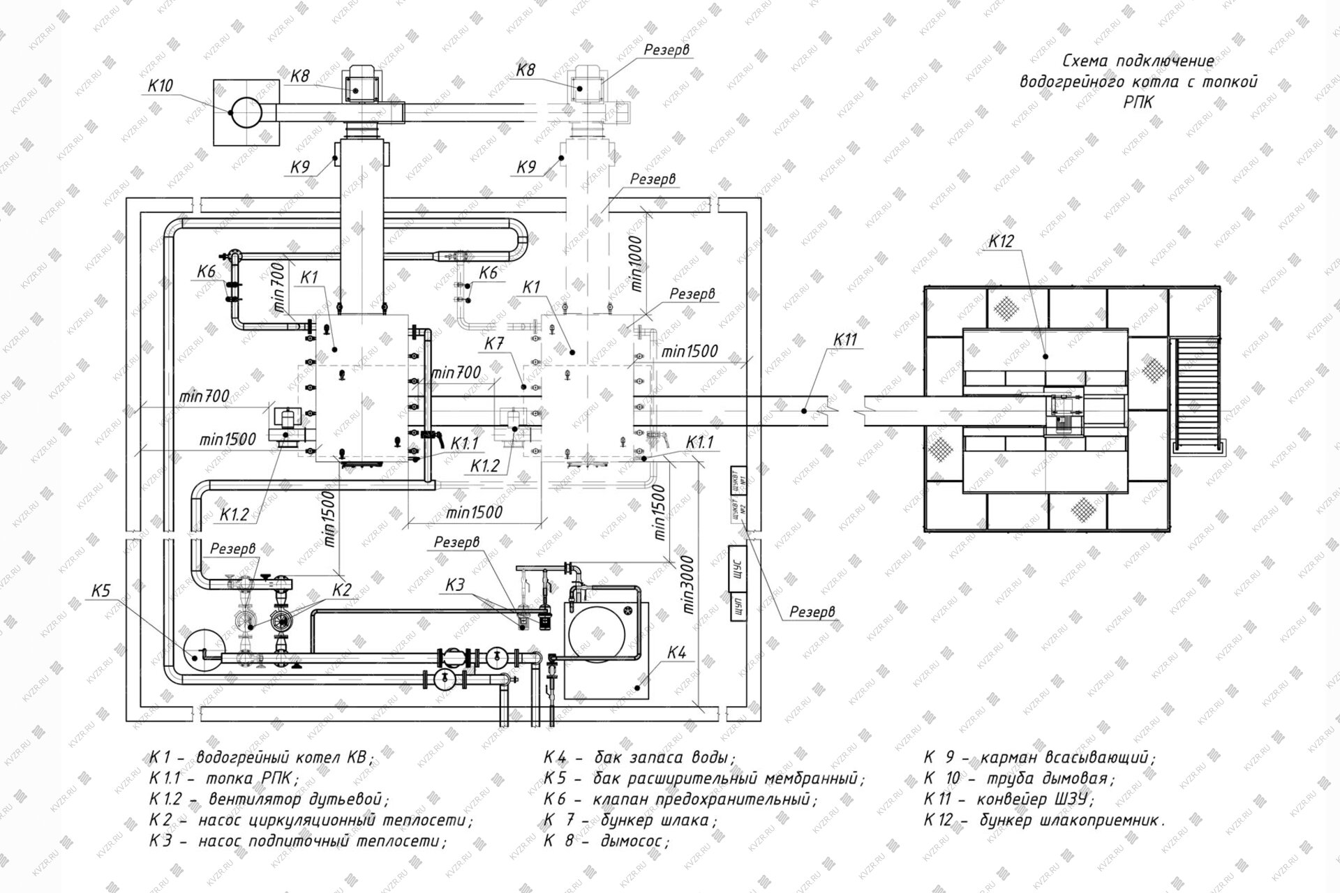 К вспомогательному оборудованию при подключении промышленного водогрейного котла КВм с РПК относят - щит управления котлом, насос циркуляционный, насос подпиточной воды, бак запаса воды, расширительный мембранный бак, транспортеры, дымовую трубу, систему газоходов и дымосос, золоуловитель (по желанию).